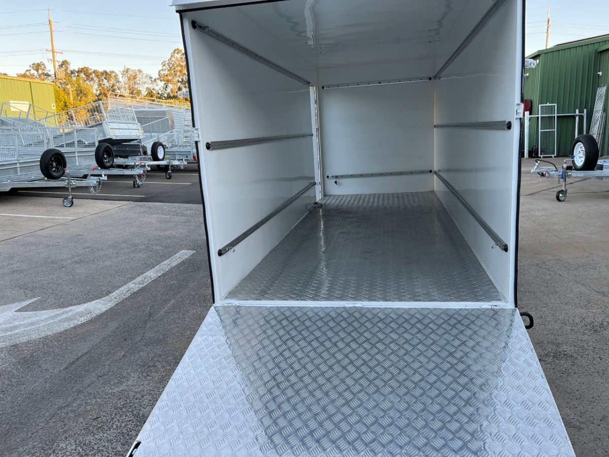 Trailer construction is 30 mm thick fully sealed box enclosure with quick release multi-position tiedown rails fitted to internal walls. This enables the securing of various size loads.